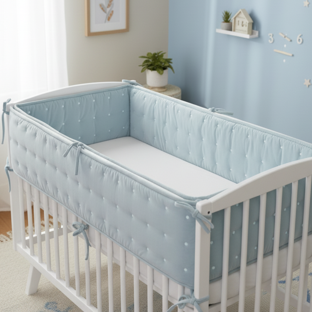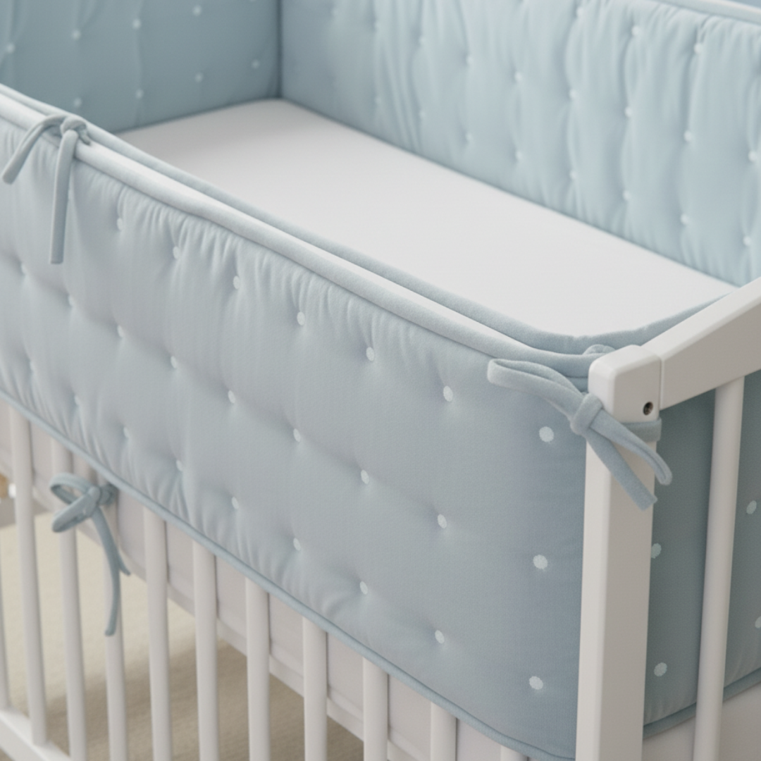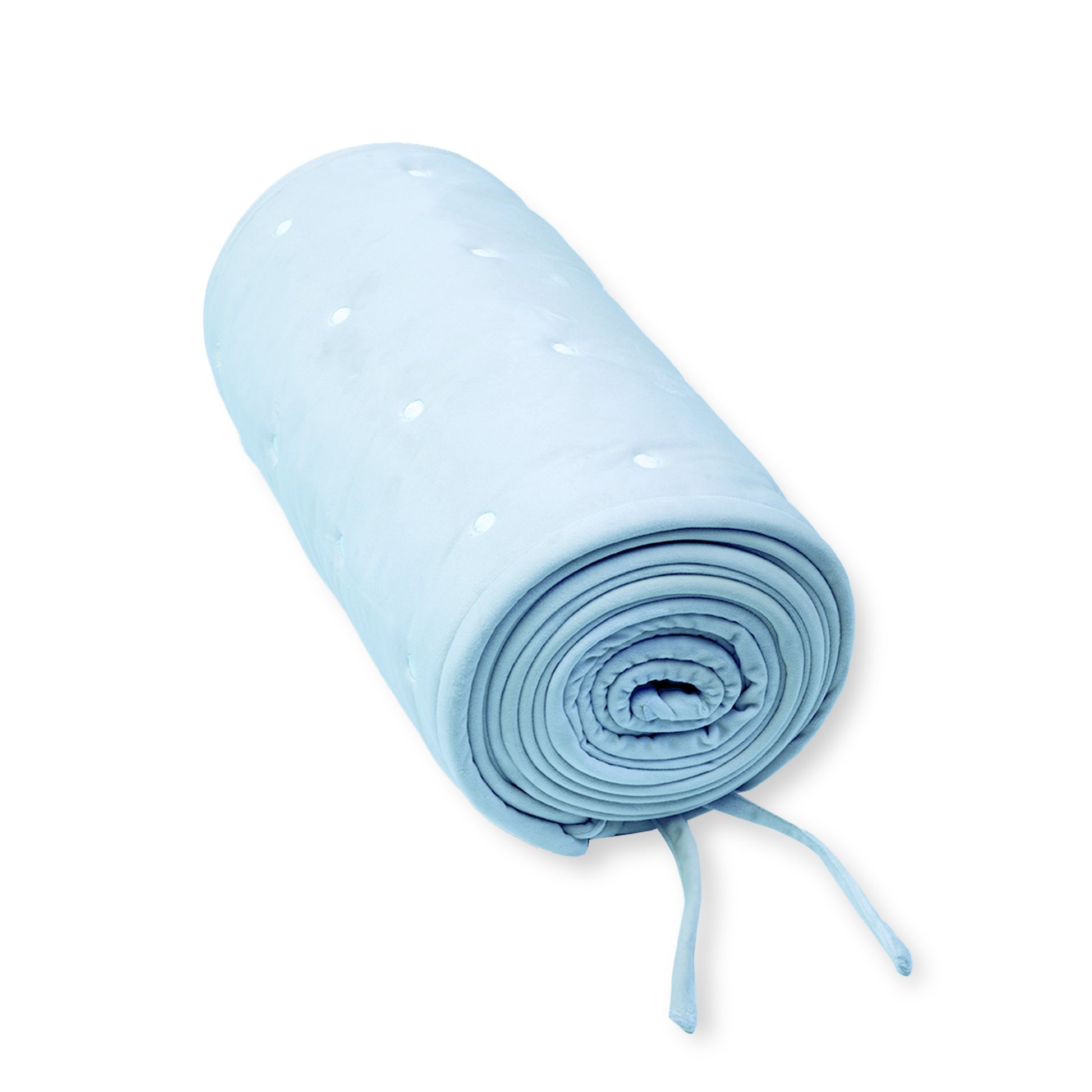 The Blue Dot Dreams Crib Bumper brings gentle color and comfort to your baby’s crib. Made with breathable velvet and light foam padding, it cushions safely while keeping a fresh, airy feel. The soft blue dots make it a timeless favorite for every nurser