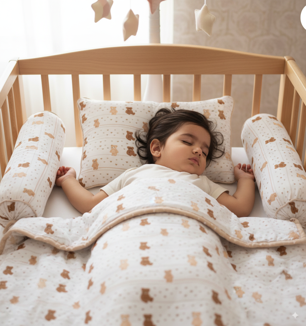 The Teddy Tales Crib Bedding Set brings playful comfort to your nursery. Crafted in soft cotton with gentle teddy prints, it’s made for restful sleep and everyday snuggles. Each piece is breathable, easy to care for, and perfectly coordinated — making it both practical and picture-perfect.